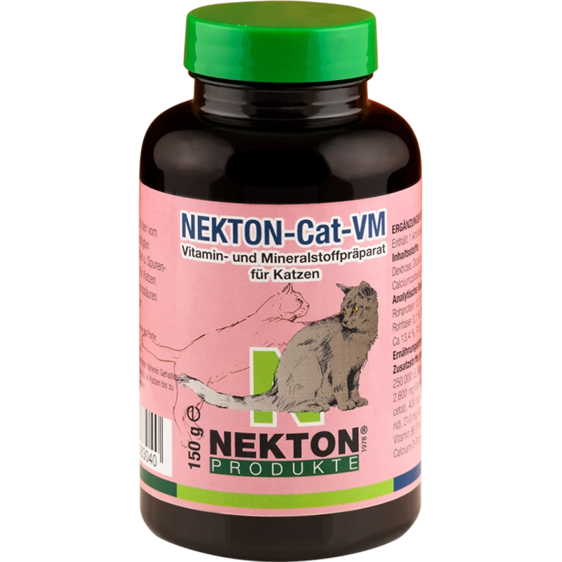NEKTON-Cat-VM contient toutes les vitamines et tous les minéraux indispensables aux chats ainsi que de la taurine, un acide aminé et de l’arginine, un acide aminosulfonique. Tous les ingrédients ont été spécialement prévus pour couvrir les besoins de ces compagnons à pattes de velours. Les vitamines comme les minéraux et les oligo-éléments comptent parmi les substances actives essentielles (indispensables) pour les chats qui ne peuvent être constituées par l’organisme, ou en quantité insuffisante si c’est le cas. Elles doivent de ce fait être constamment proposées par le biais de la nourriture. NEKTON-Cat-VM protège des carences nutritionnelle et aide l’organisme à être régulier . Une préparation basique d’une grande valeur nutritive pour apporter au chat les vitamines et minéraux dont il a besoin.